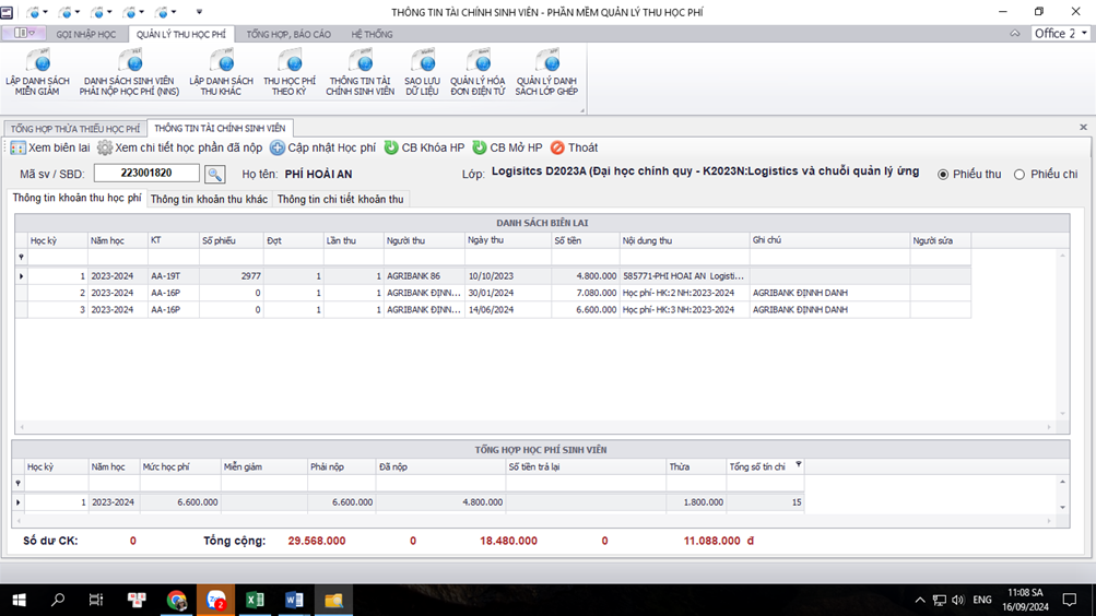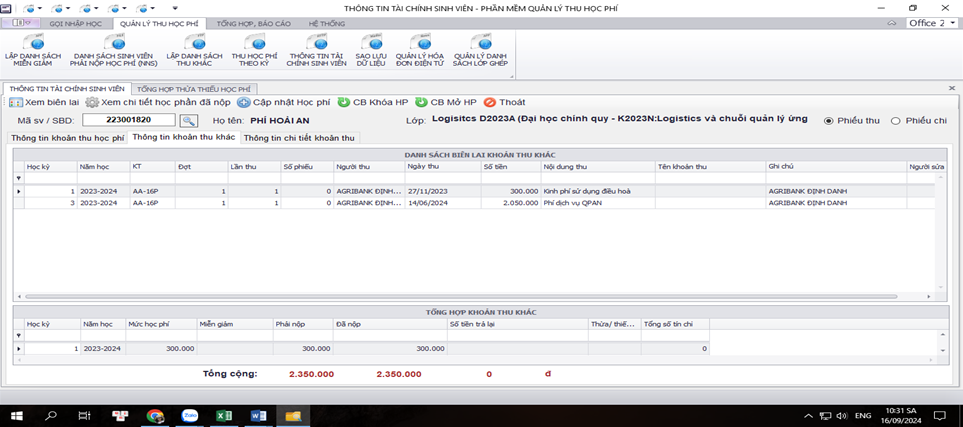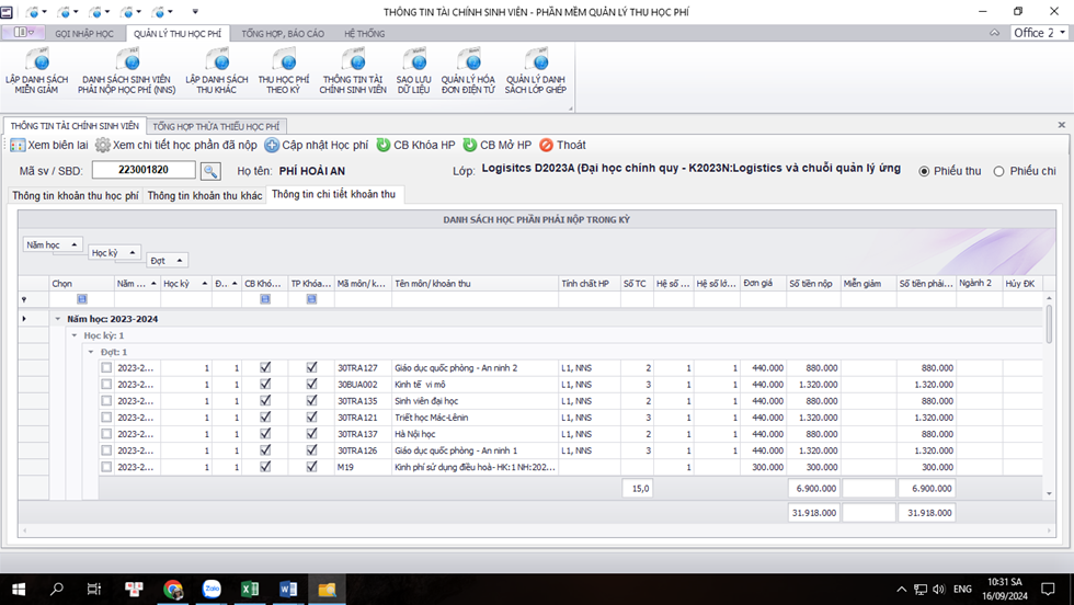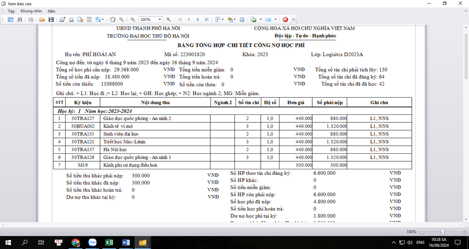 Khi chọn vào mục “ thông tin chi tiết khoản thu” màn hình sẽ hiện ra giao diện dưới đây, tại giao diện này người học có thế tra xét chi tiết các khoản cần nôp/ trả nhà trường cụ thể và tổng số tiền cần nôp/ trả như: học phí cần nộp cho từng môn học, các khoản phải trả, phải nộp khác