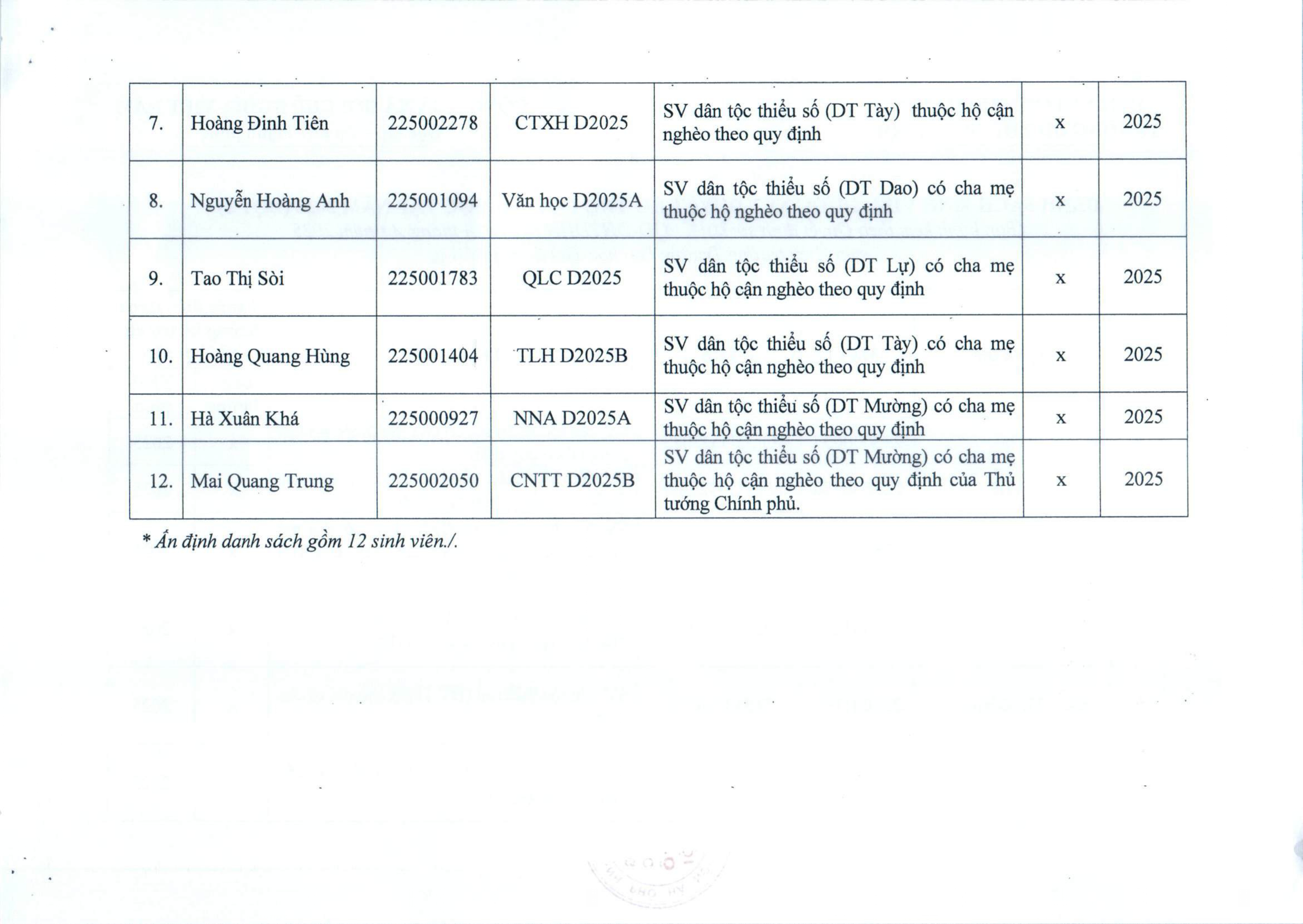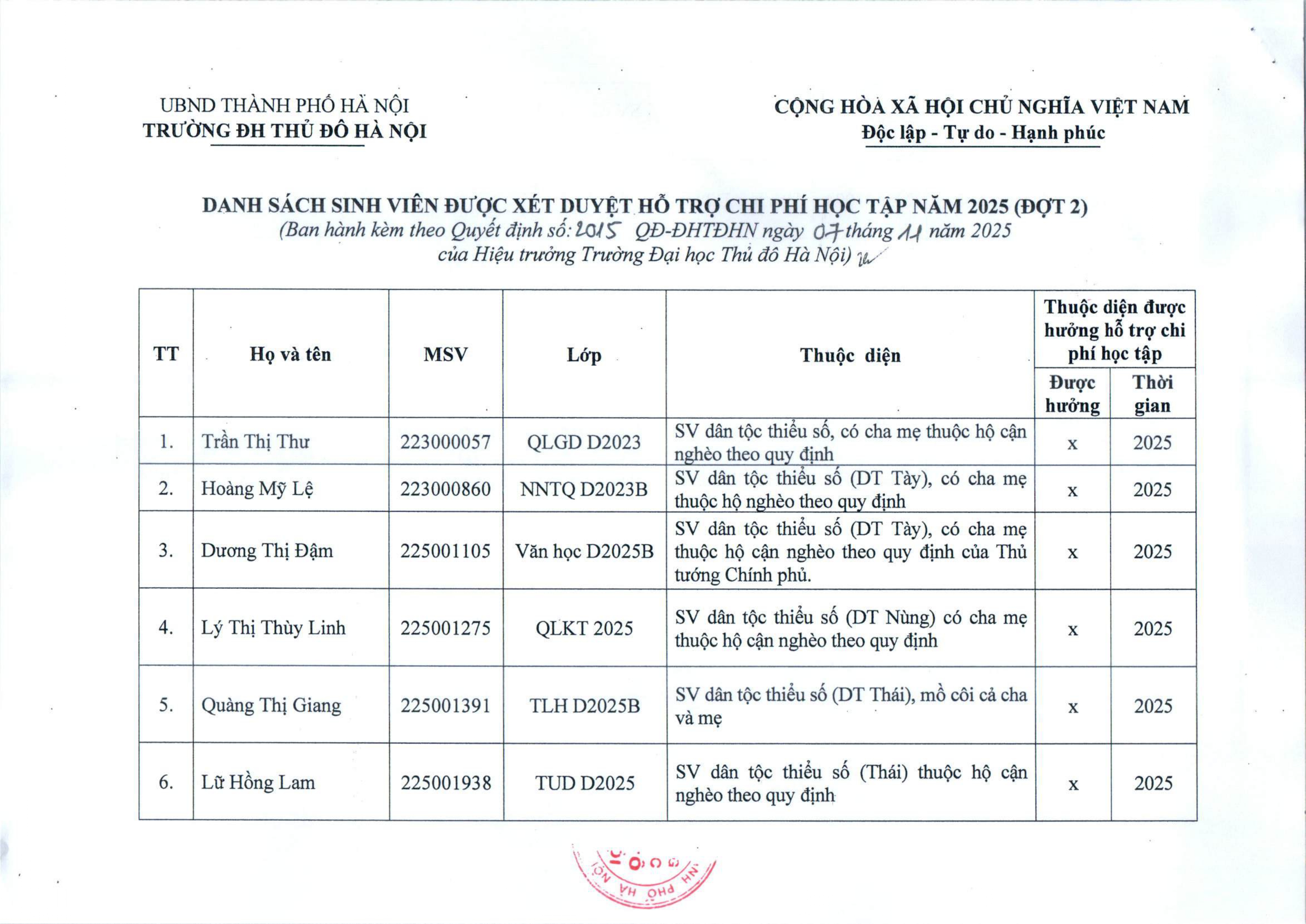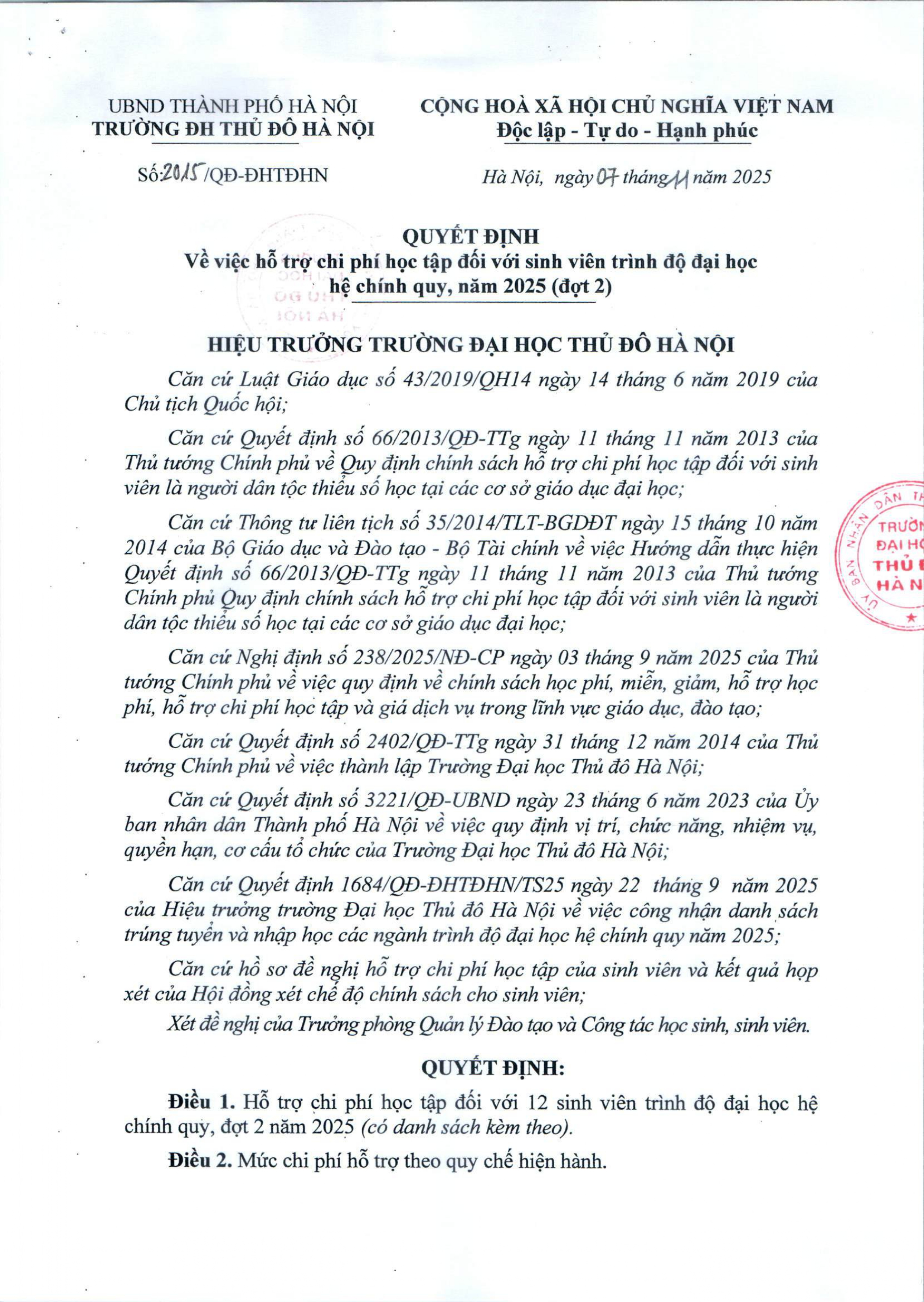 Quyết định hỗ trợ chi phí học tập đối với sinh viên trình độ đại học hệ chính quy, năm học 2025 ( đợt 2 )