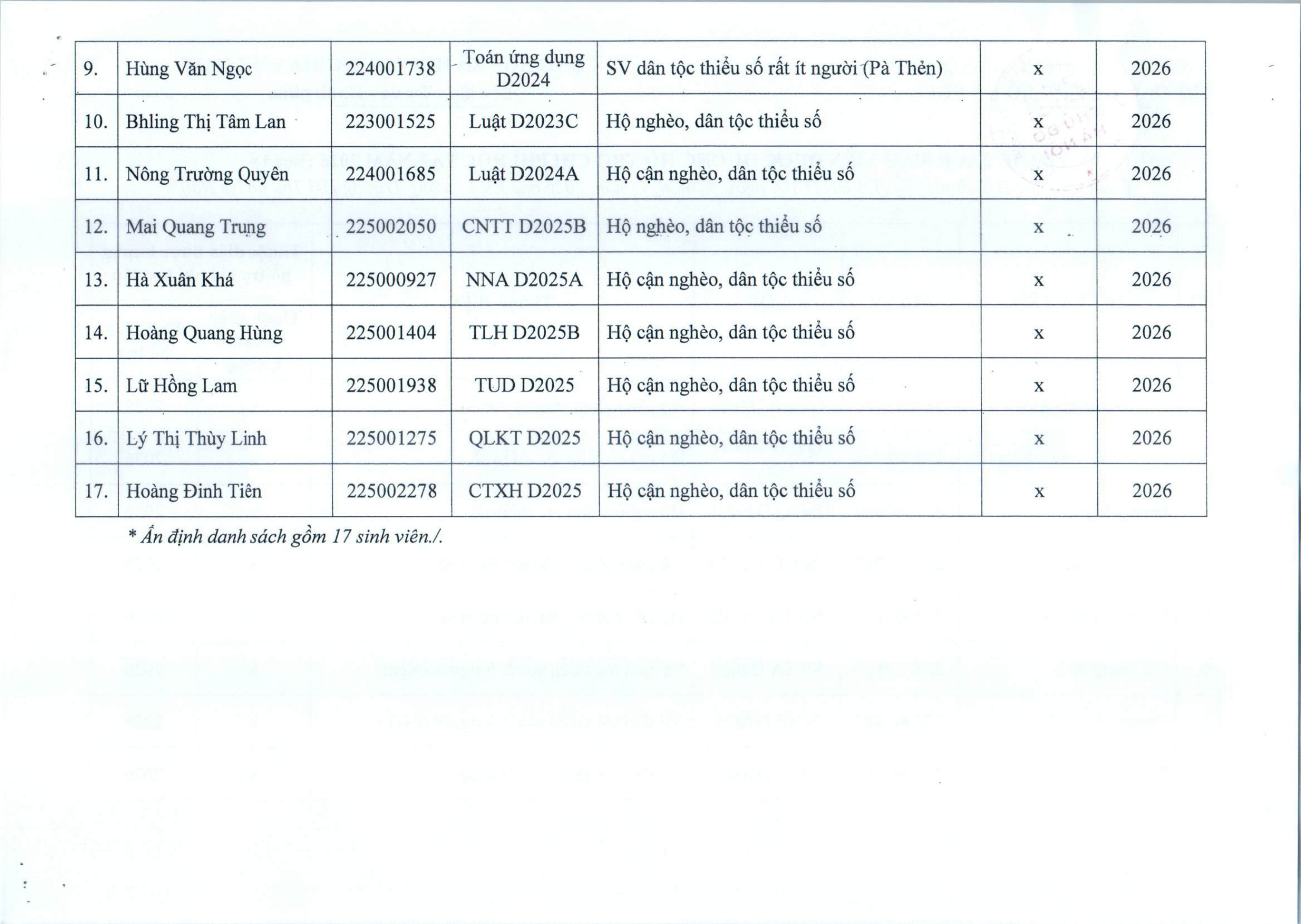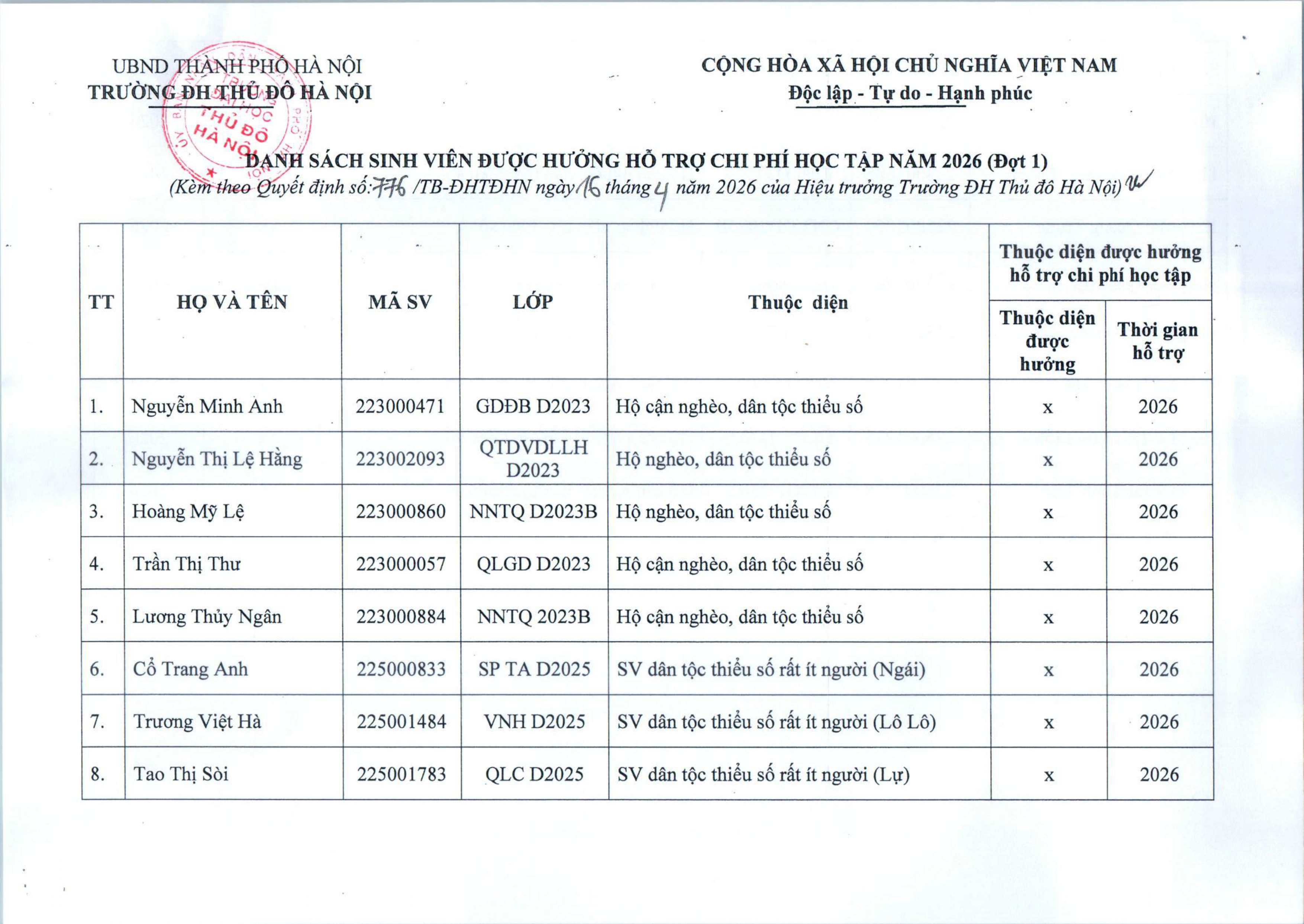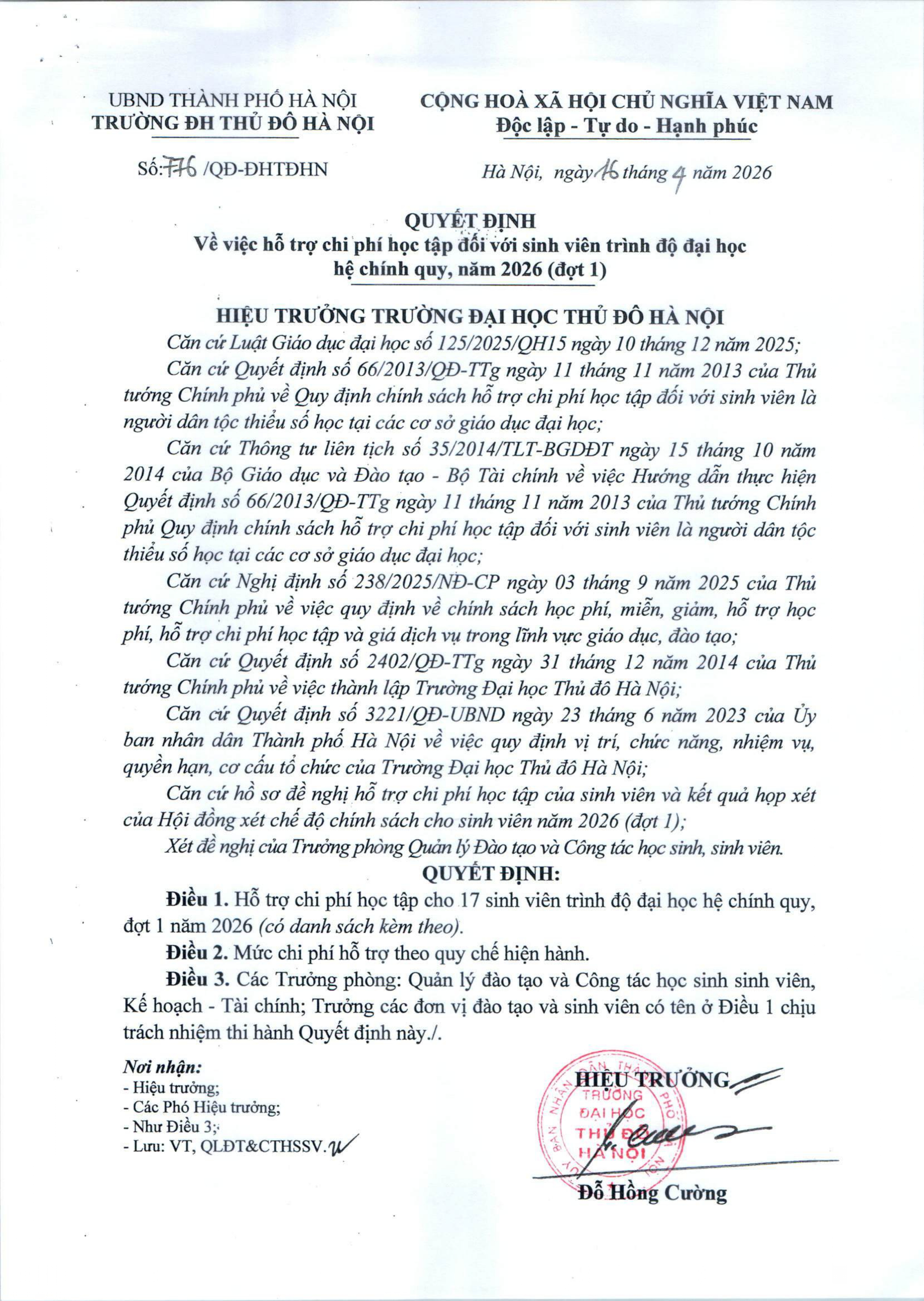 Quyết định về việc hỗ trợ chi phí học tập đối với sinh viên trình độ đại học hệ chính quy, năm 2026 (đợt 1)