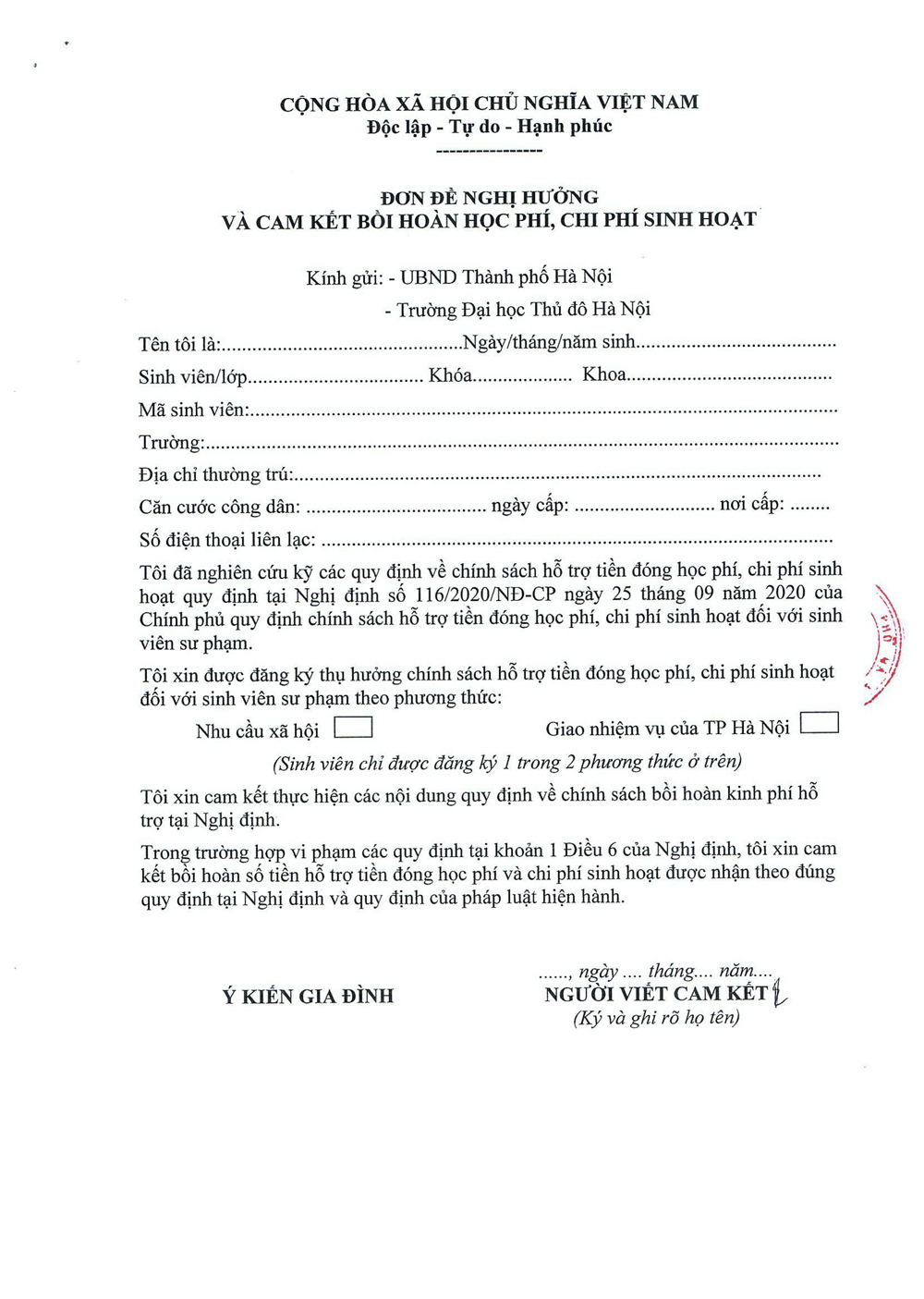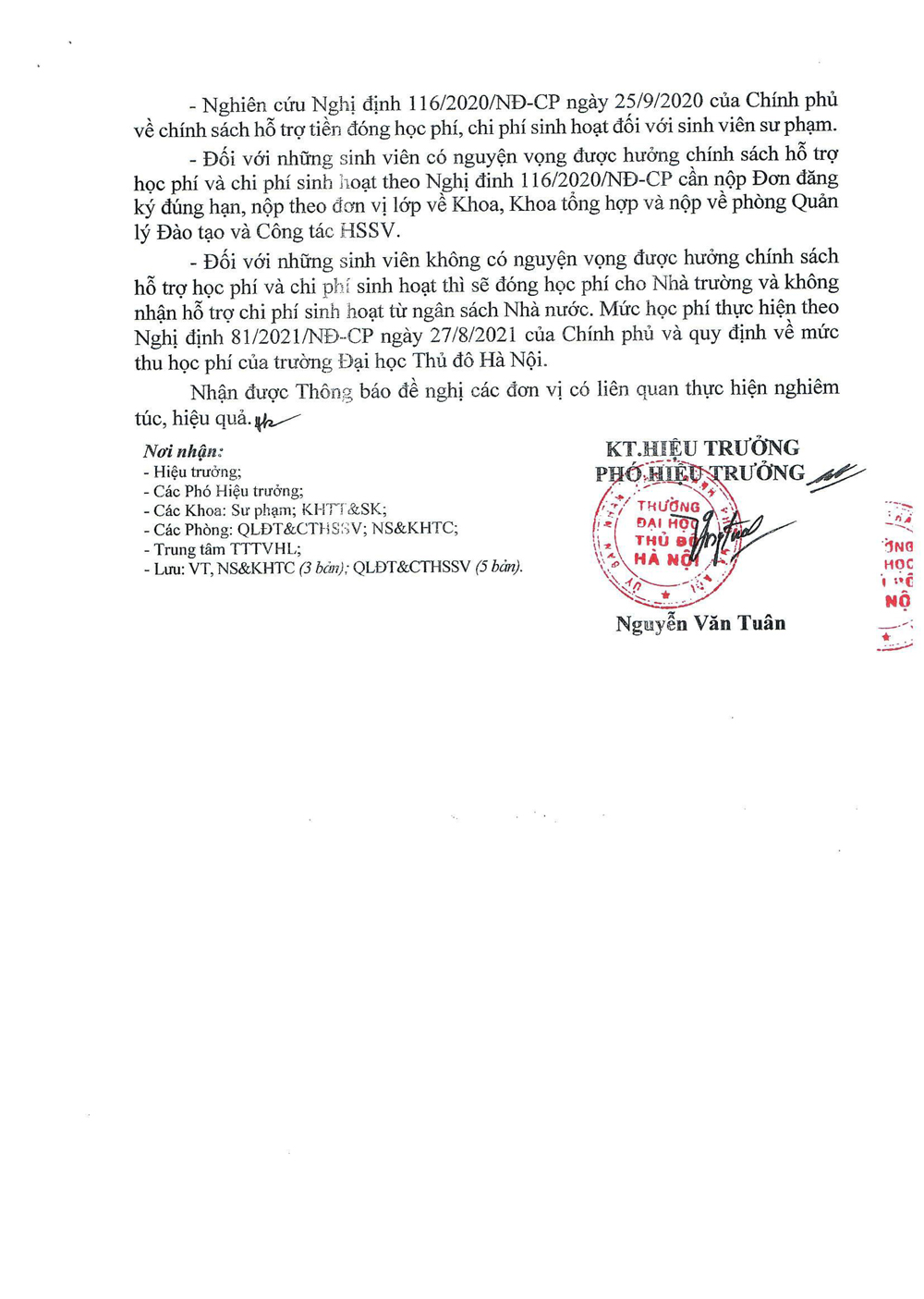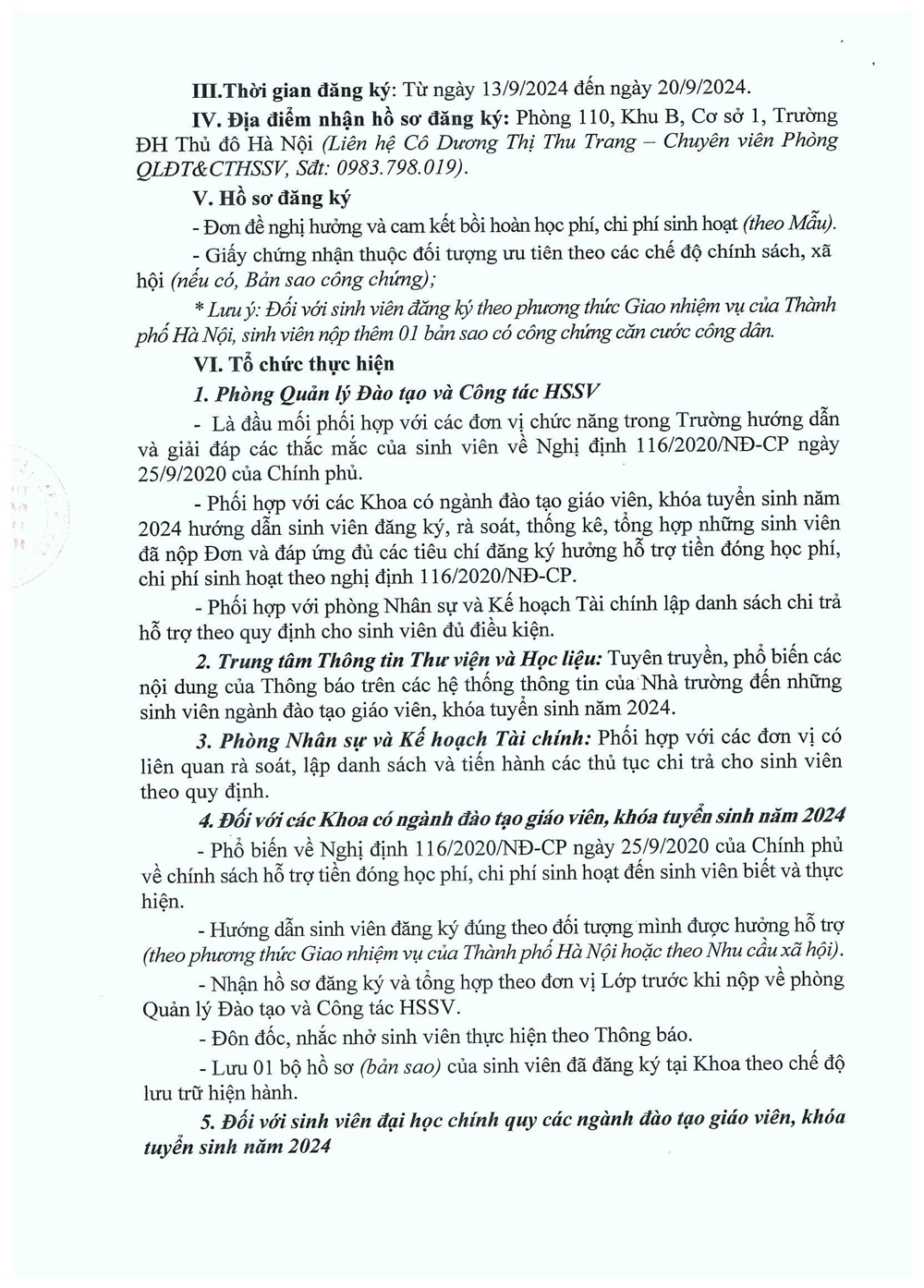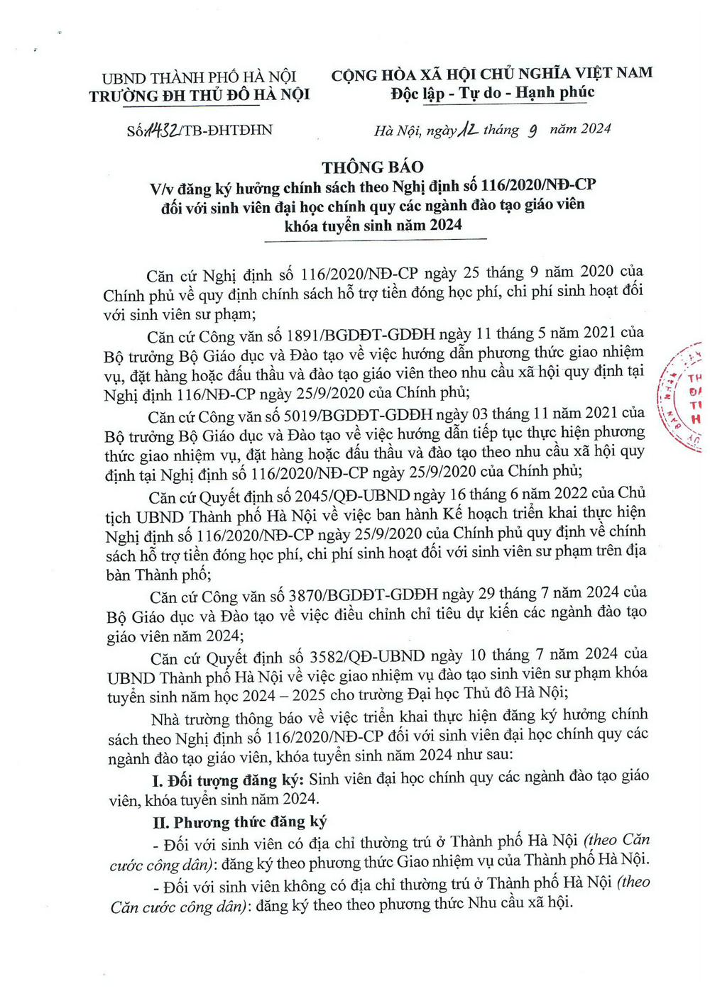 Thông báo đăng ký hưởng chính sách theo Nghị định 116/2020/NĐ-CP đối với sinh viên đại học chính quy các ngành đào tạo giáo viên khóa tuyển sinh năm 2024