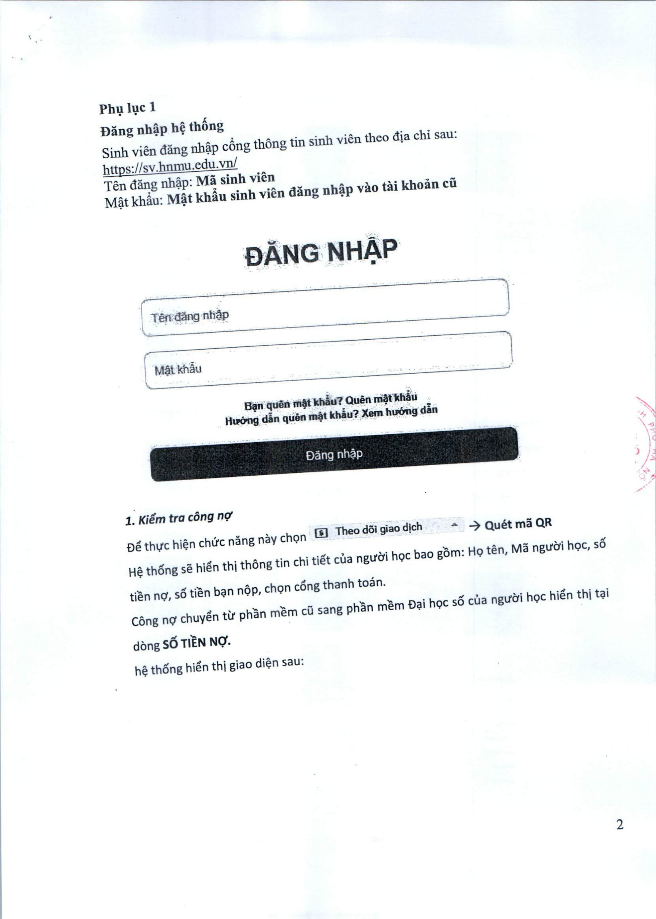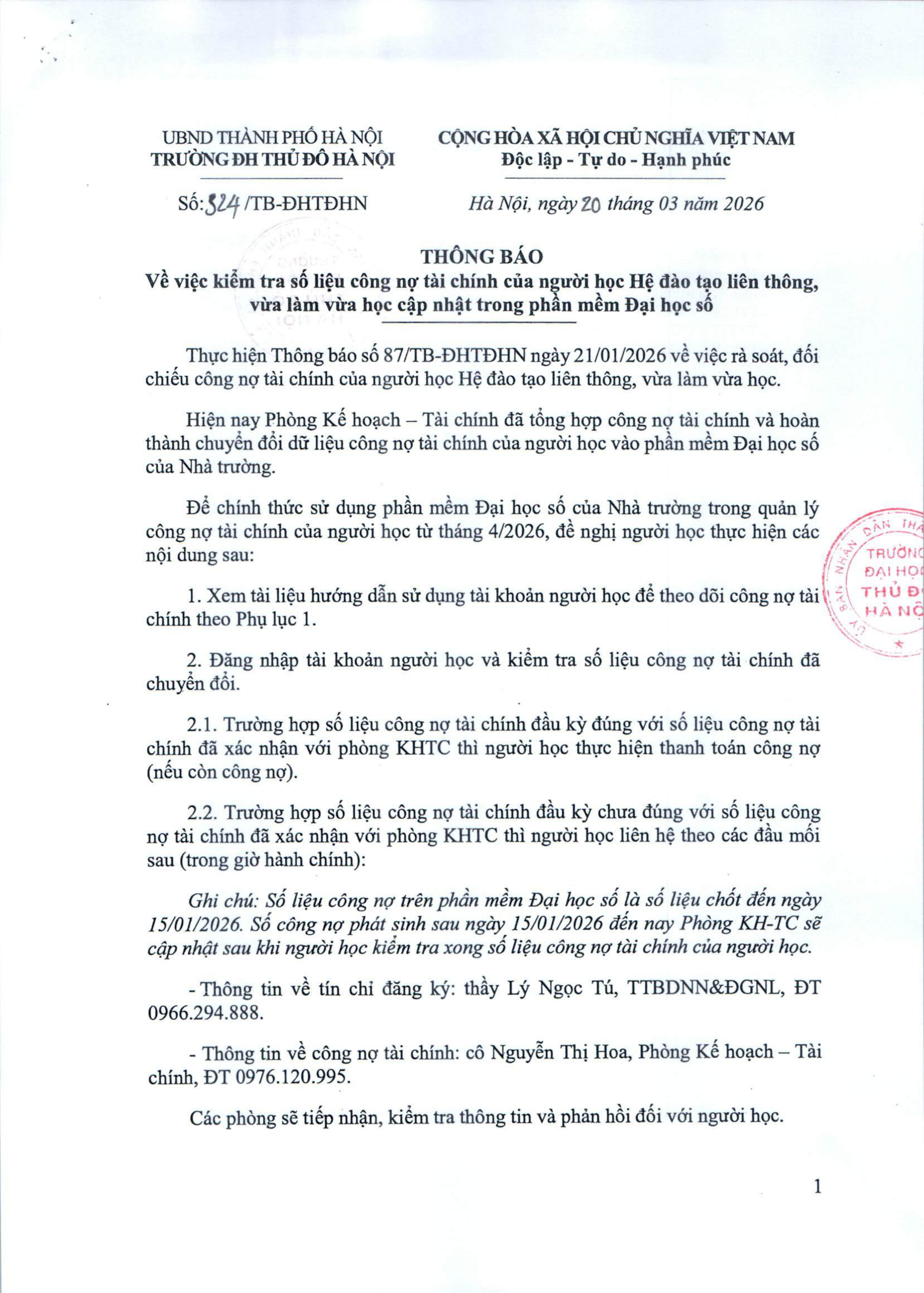 Thông báo kiểm tra số liệu công nợ tài chính của người học Hệ đào tạo liên thông, vừa làm vừa học cập nhật trong phần mềm Đại học số