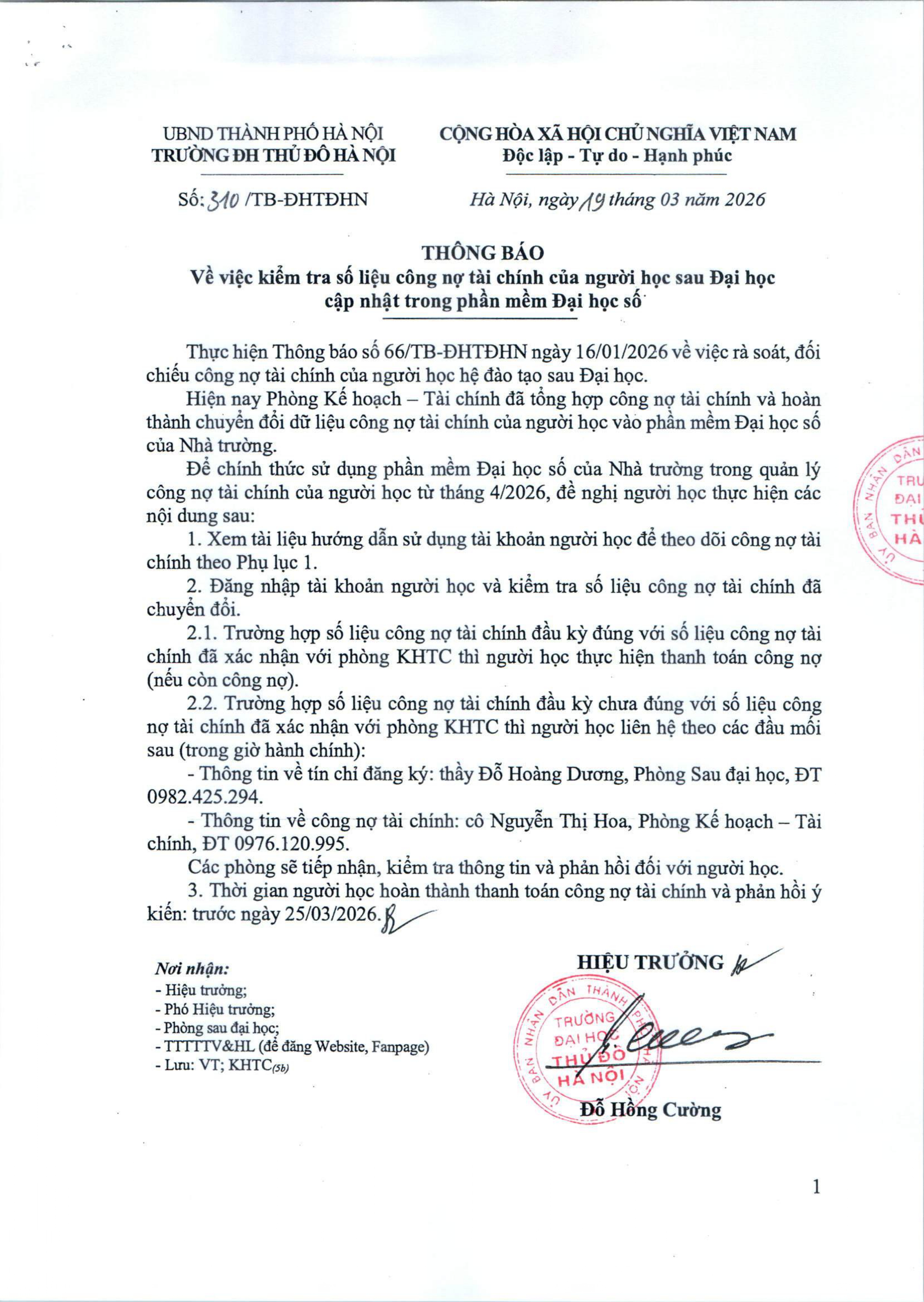 Thông báo kiểm tra số liệu công nợ tài chính của người học sau Đại học cập nhật trong phần mềm Đại học số