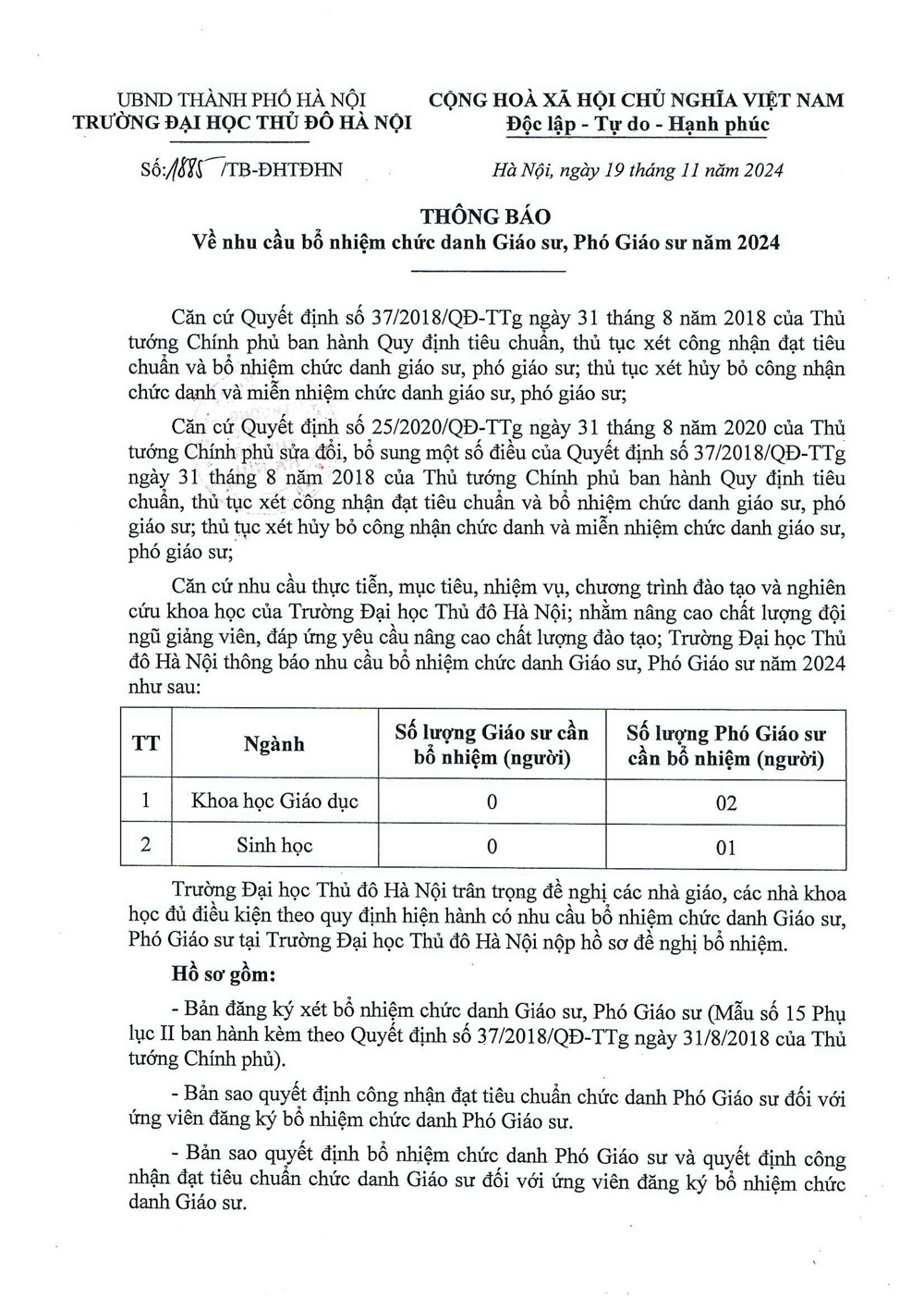 Thông báo nhu cầu bổ nhiệm chức danh Giáo sư, Phó Giáo sư năm 2024