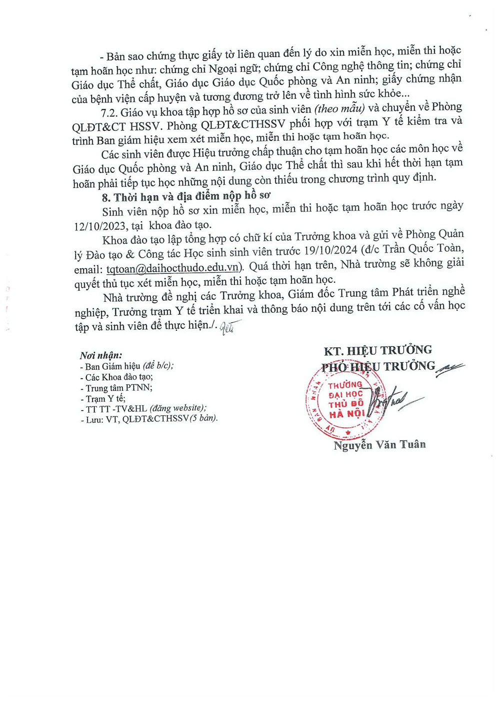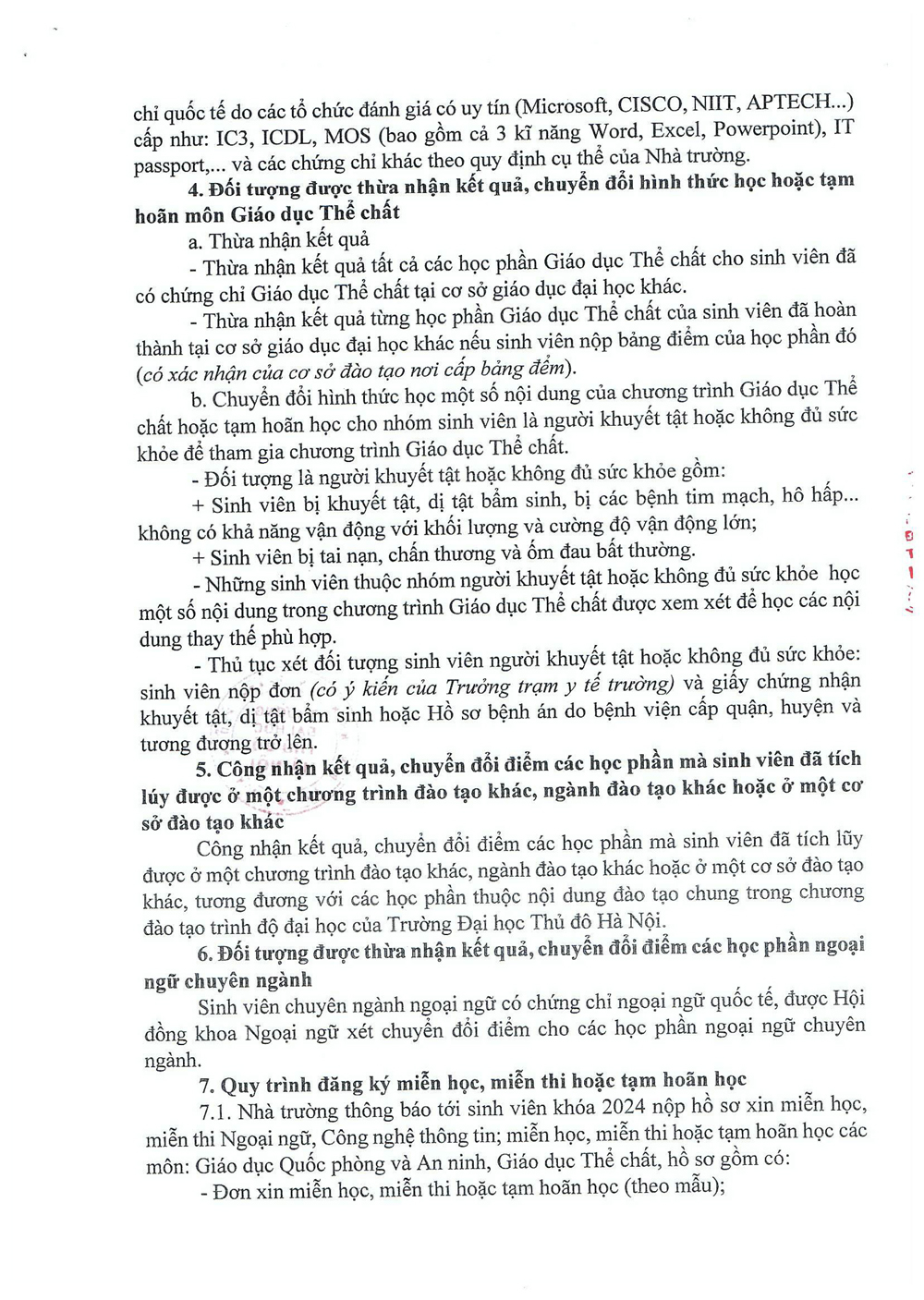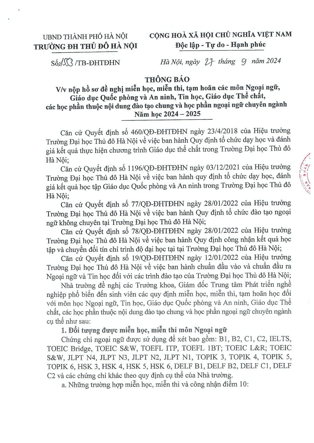 Thông báo nộp hồ sơ miễn học, miễn thi, tạm hoãn các môn Ngoại ngữ, Giáo dục quốc phòng và An ninh, tin học, Giáo dục Thể chất, các học phần thuộc nội dung đào tạo và học phần ngoại ngữ chuyên ngành năm học 2024-2025