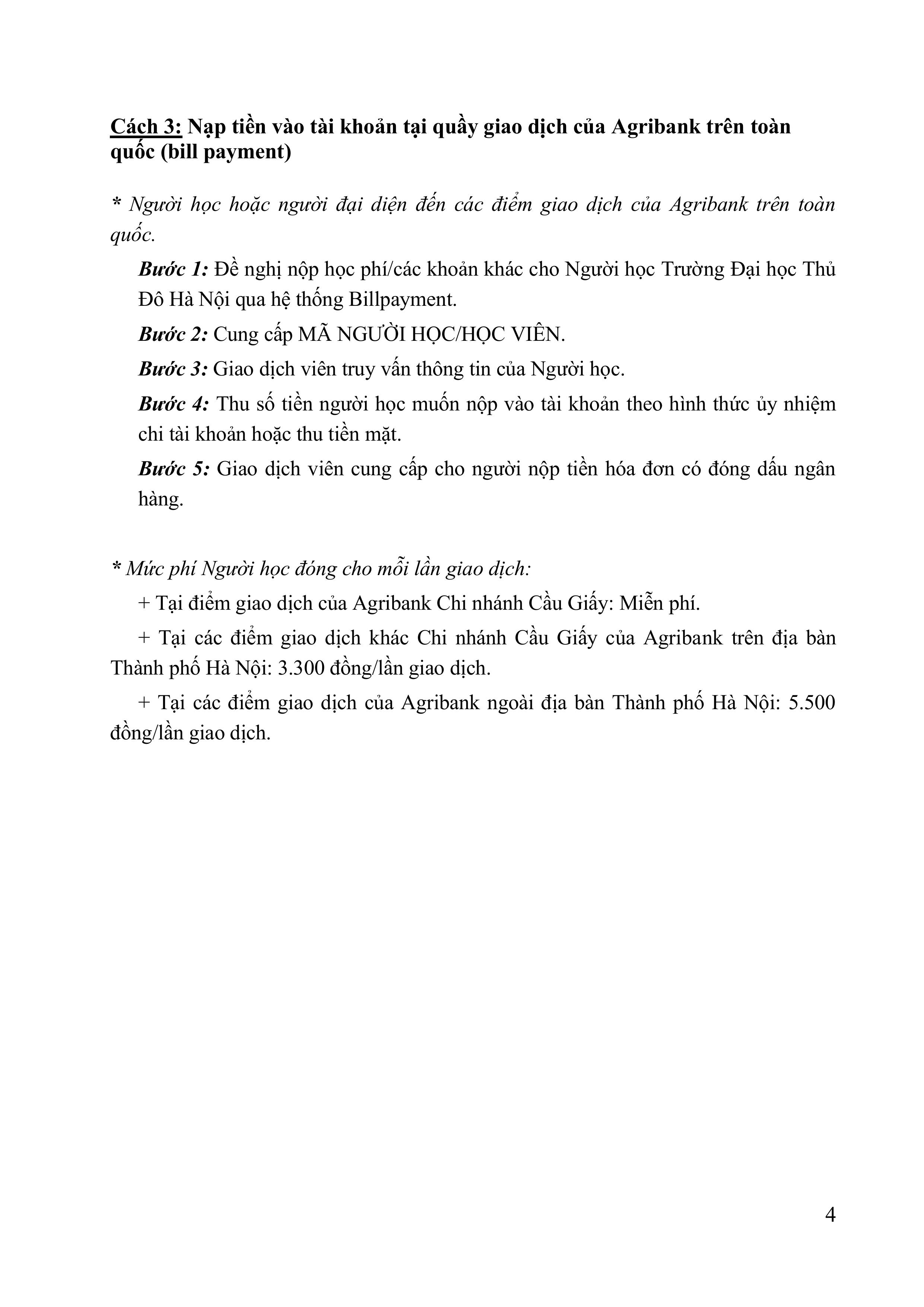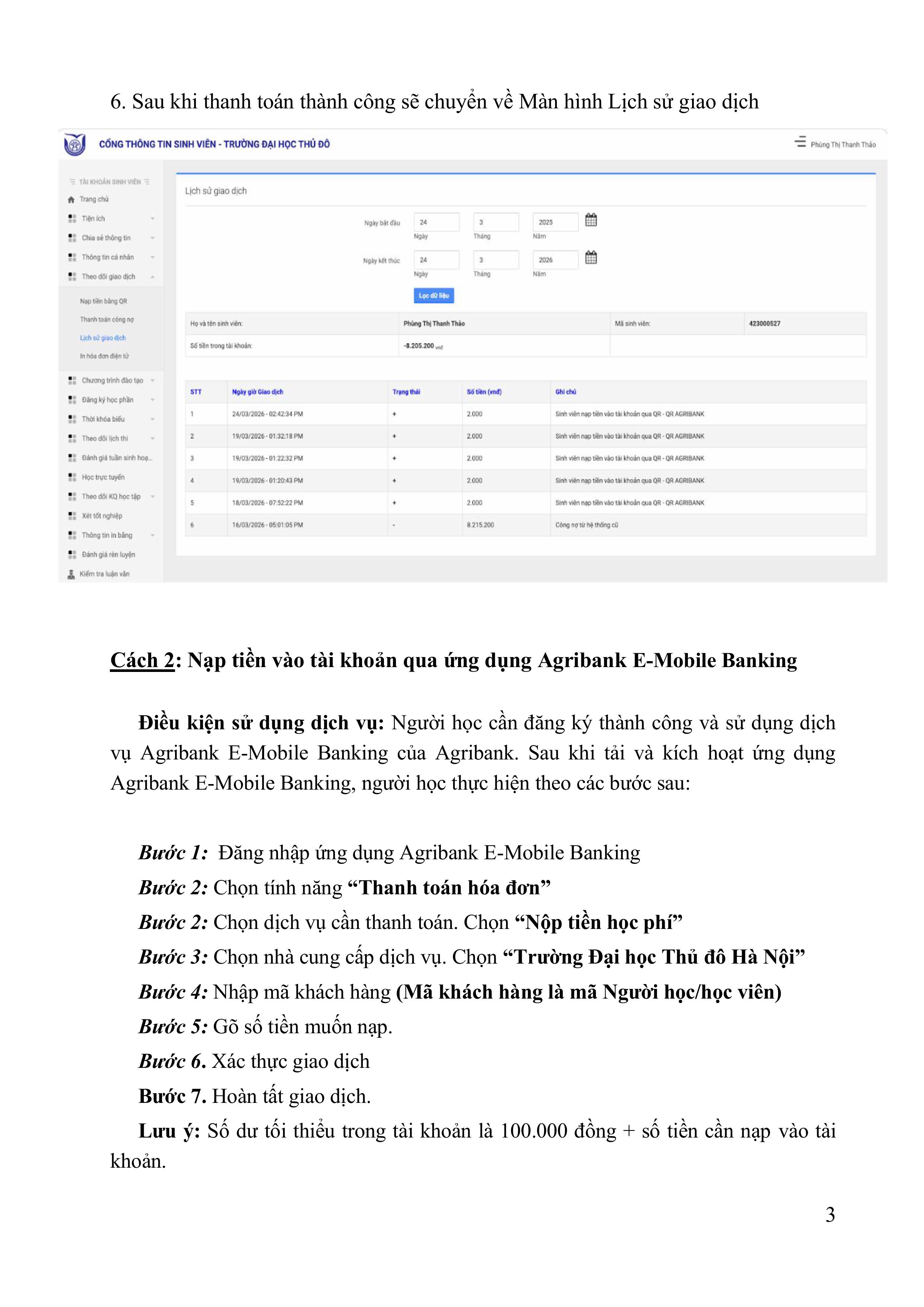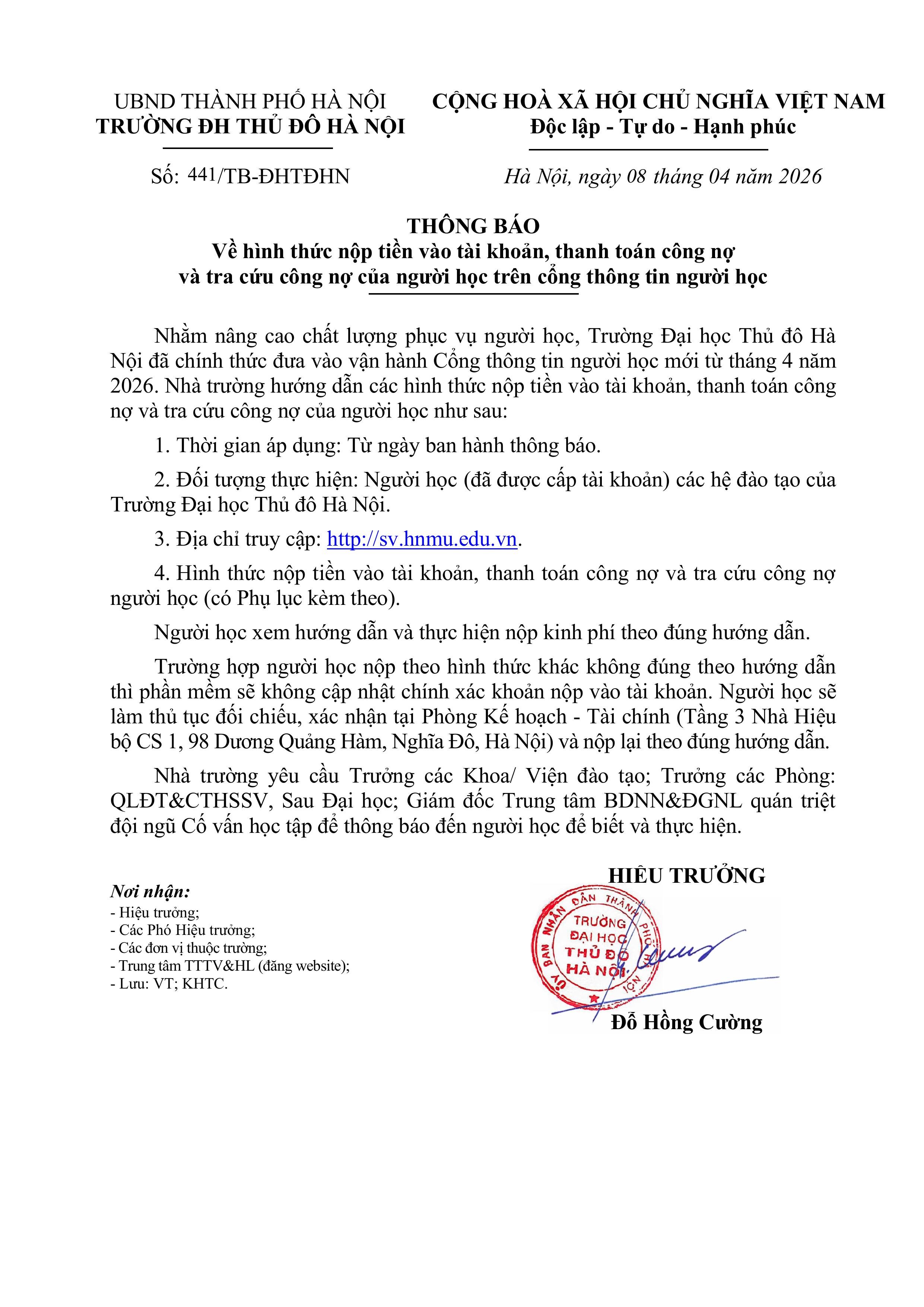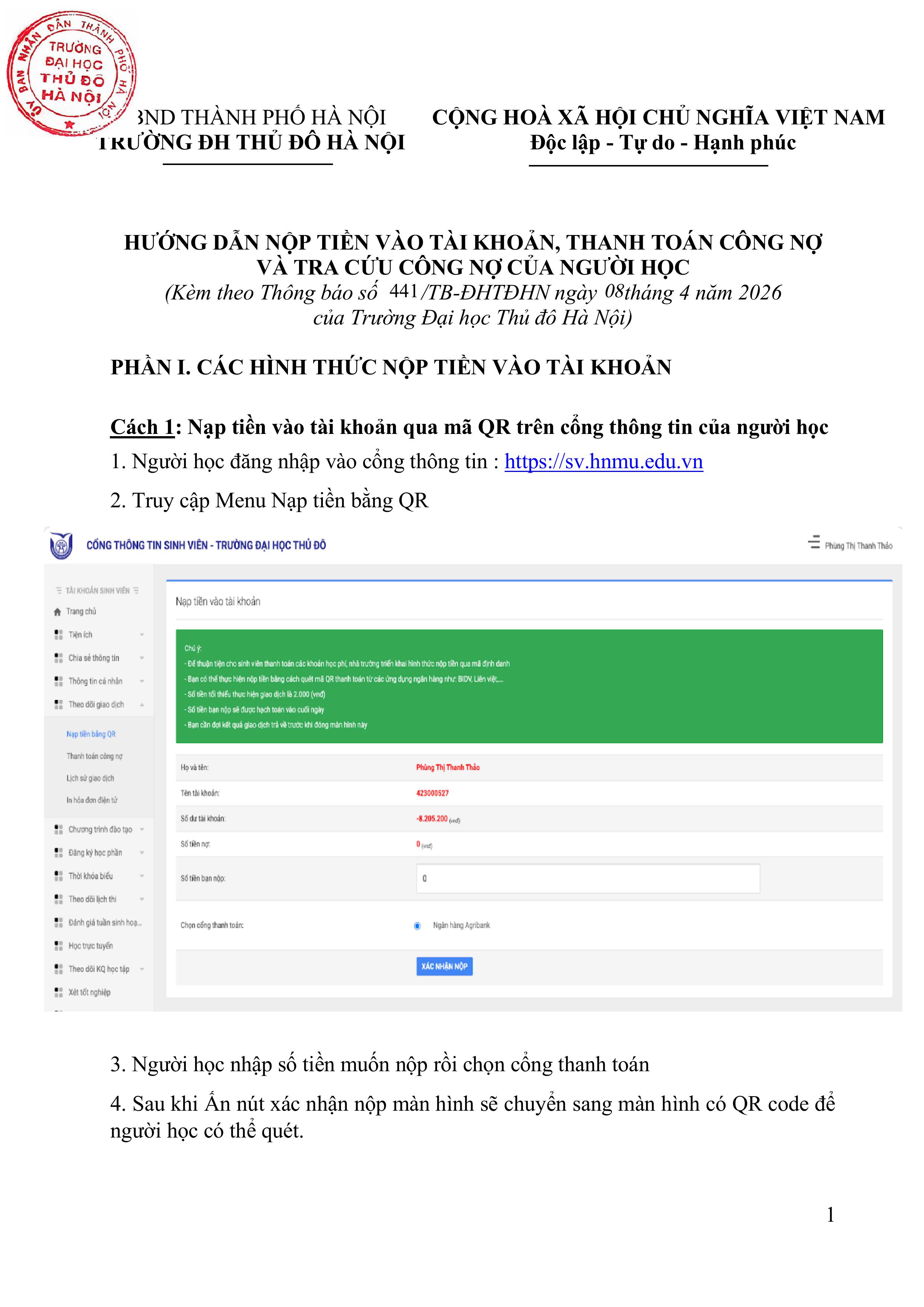 Thông báo về hình thức nộp tiền vào tài khoản, thanh toán công nợ và tra cứu công nợ của người học trên cổng thông tin người học