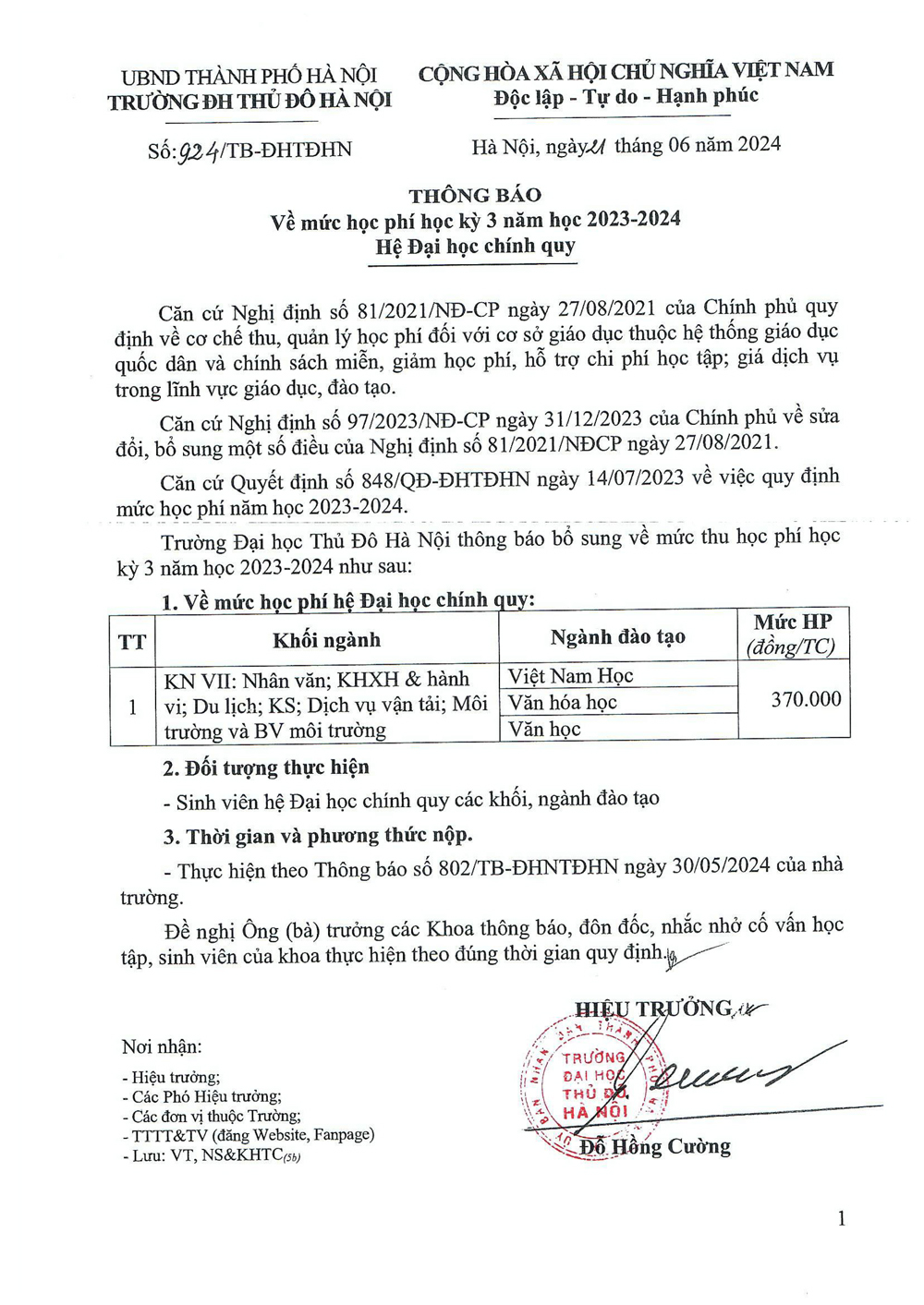 Thông báo về mức học phí kỳ 3 năm học 2023-2024 Hệ Đại học chính quy
