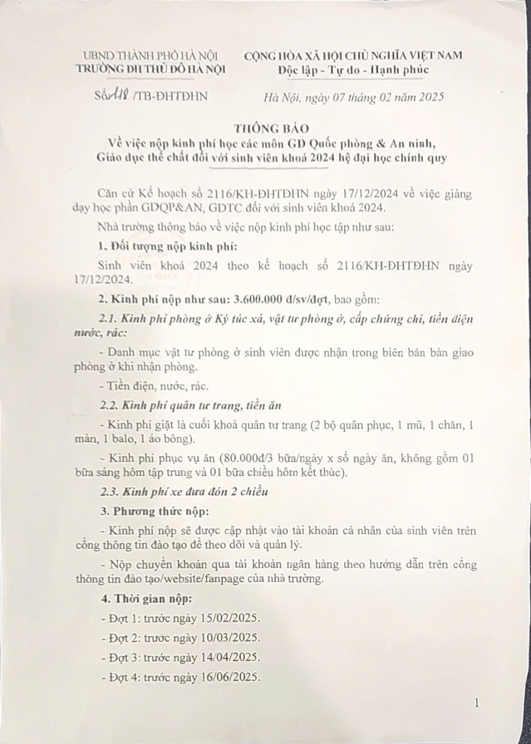 Thông báo về việc nộp kinh phí học các môn GD QP & AN, giáo dục thể chất đối với sinh viên khóa 2024 - Hệ đại học chính quy 20/02/2025 18:45:14 | Số lần xem: 250 1 phút